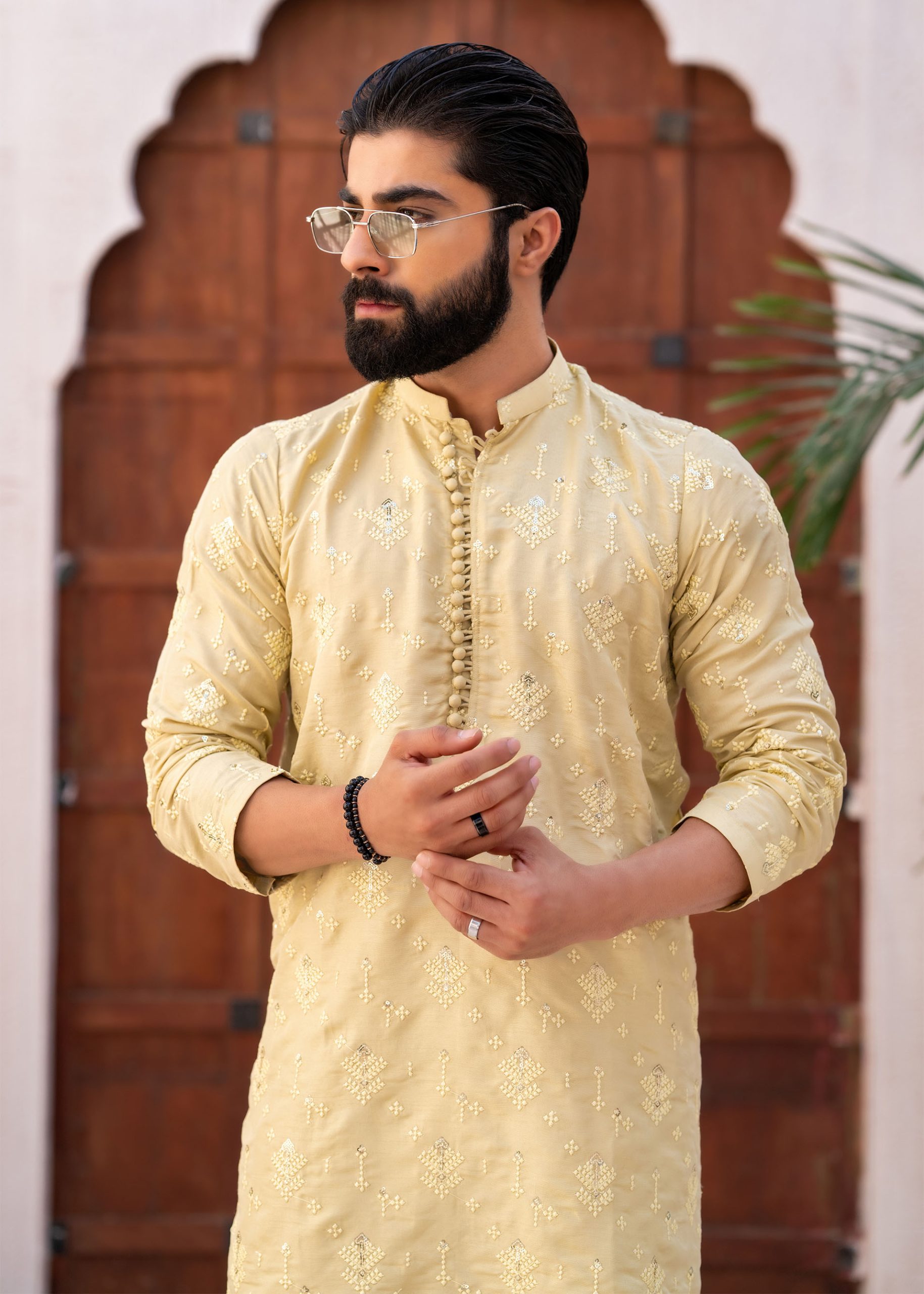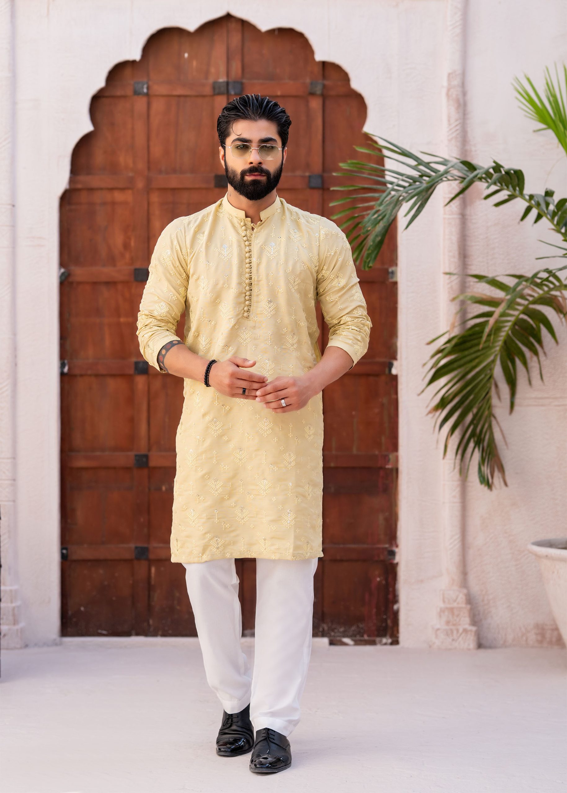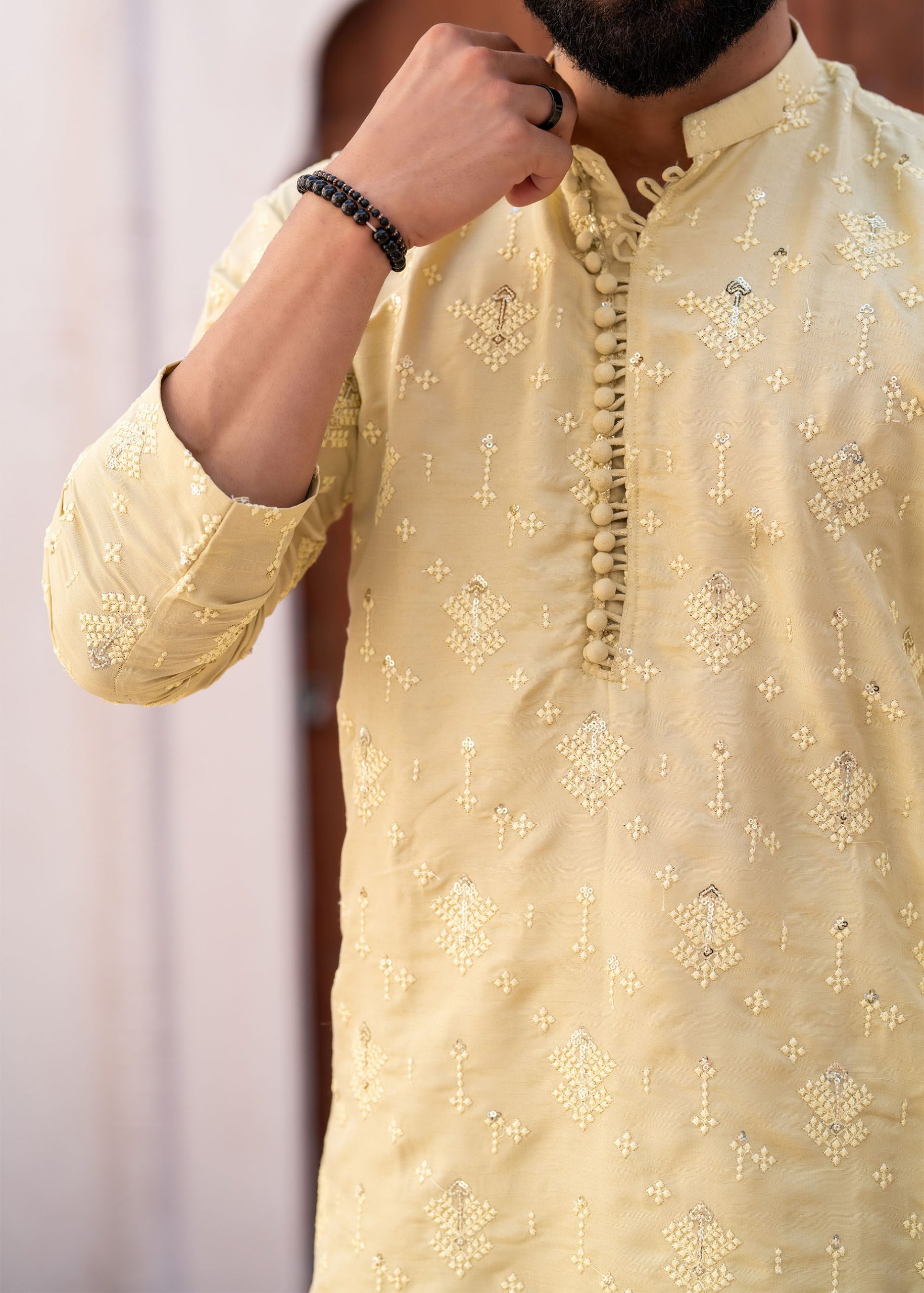 Designed with a refined band collar and a sleek buttoned placket, this kurta showcases intricate all-over embroidery that adds depth and character to the fabric. The subtle detailing on the collar and chest enhances its elegant appeal.
