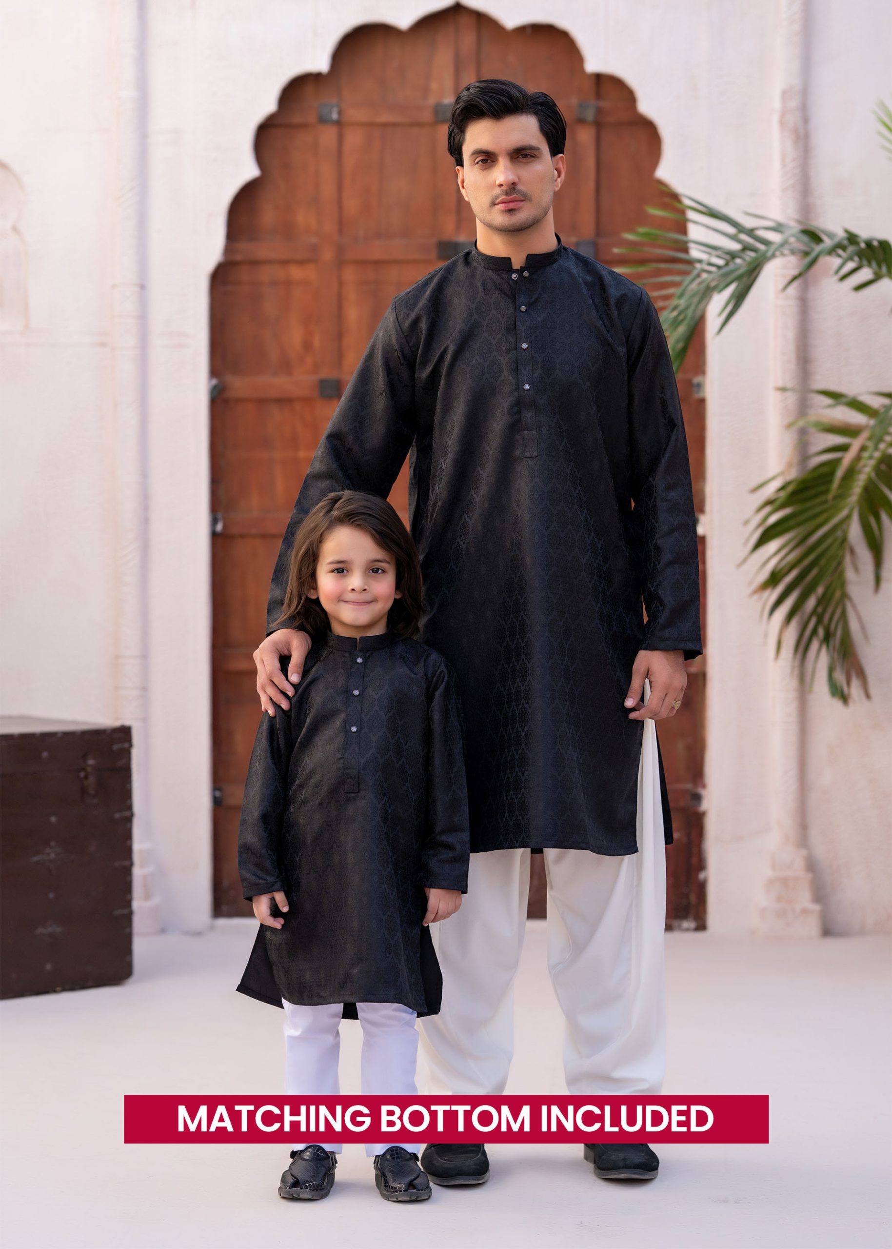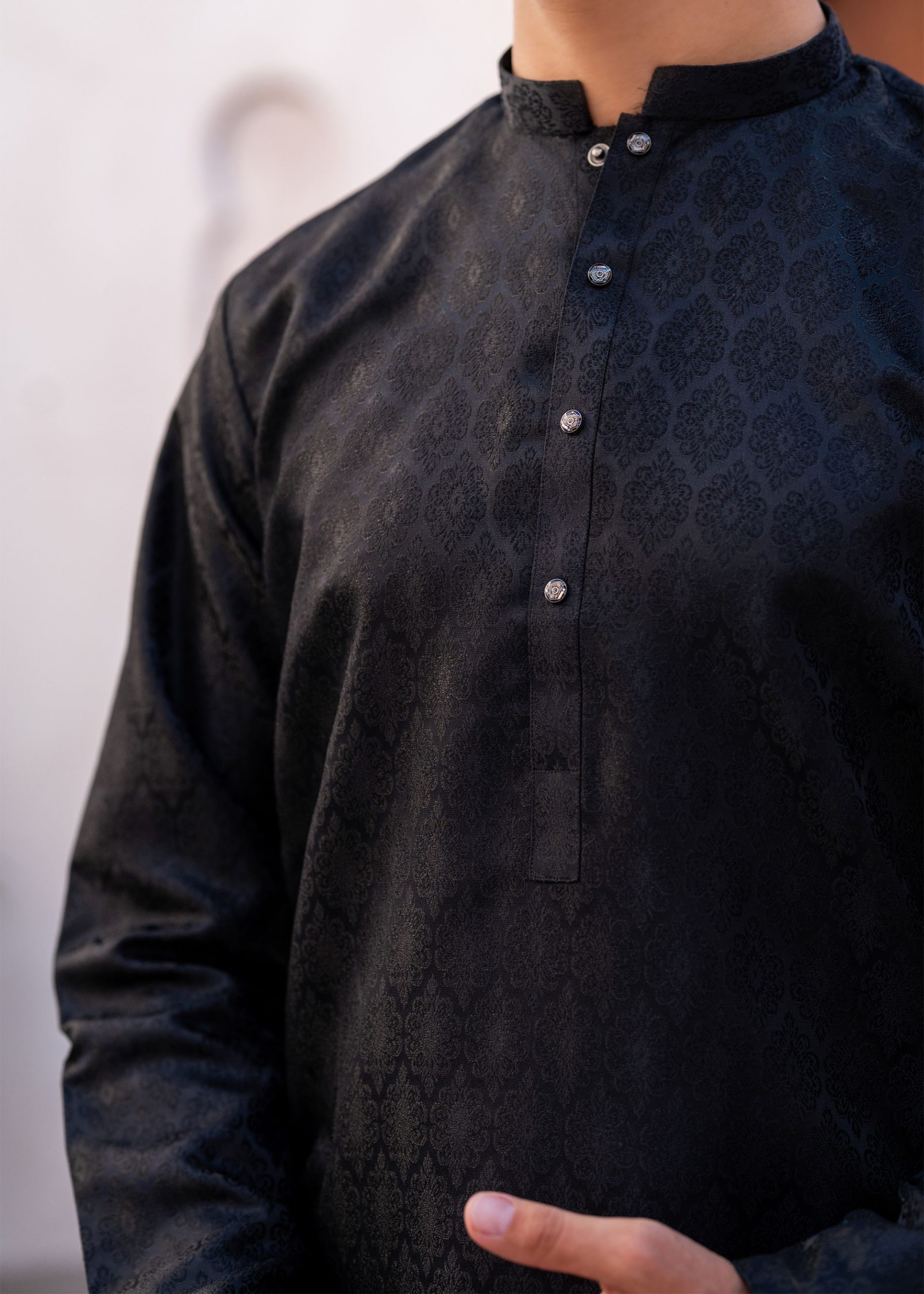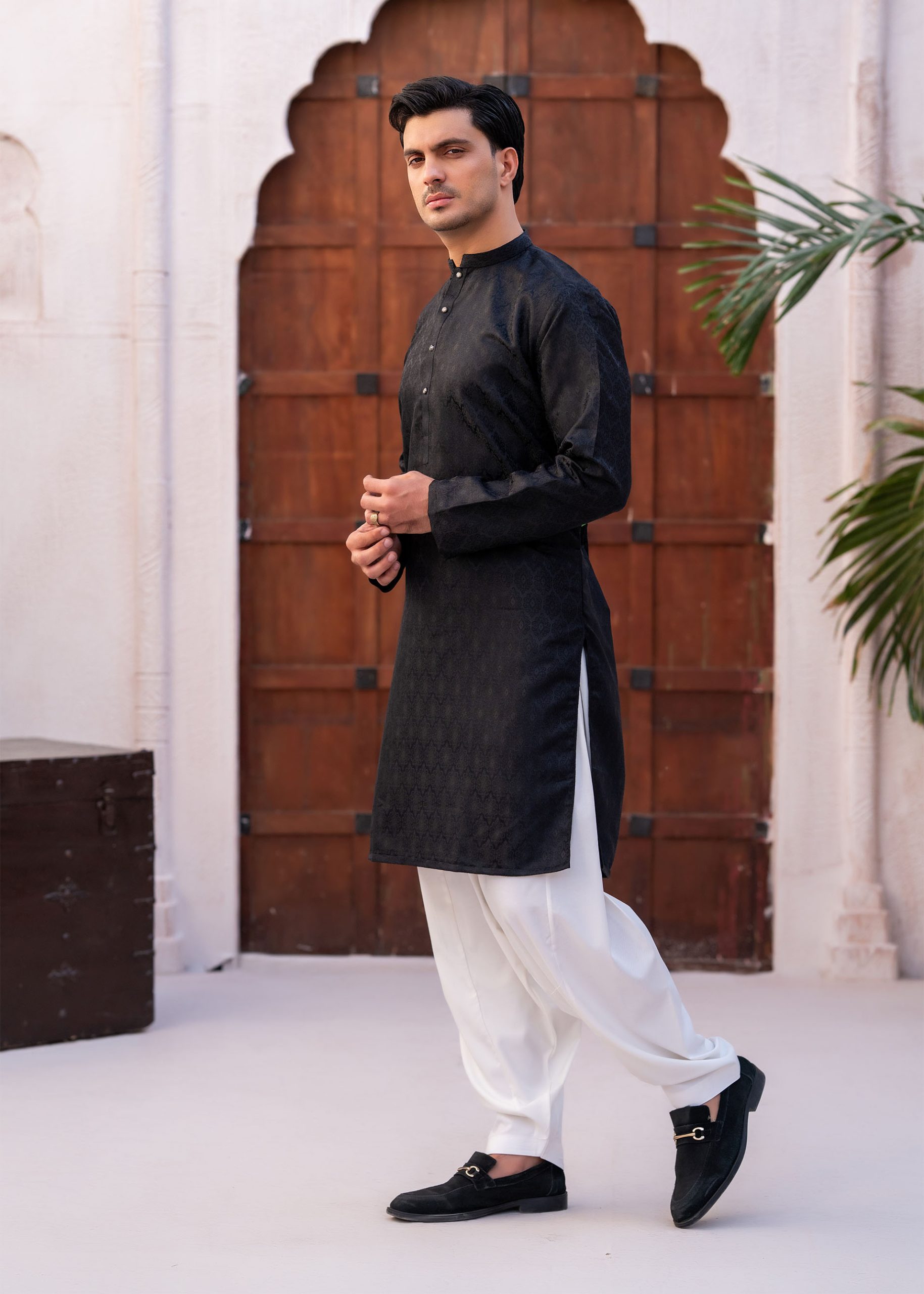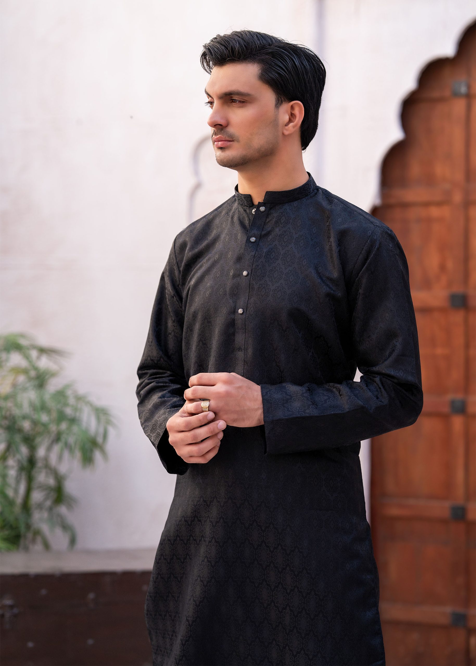 A premium banarsi kurta, featuring a sleek, tailored fit and a rich fabric with an elegant print.