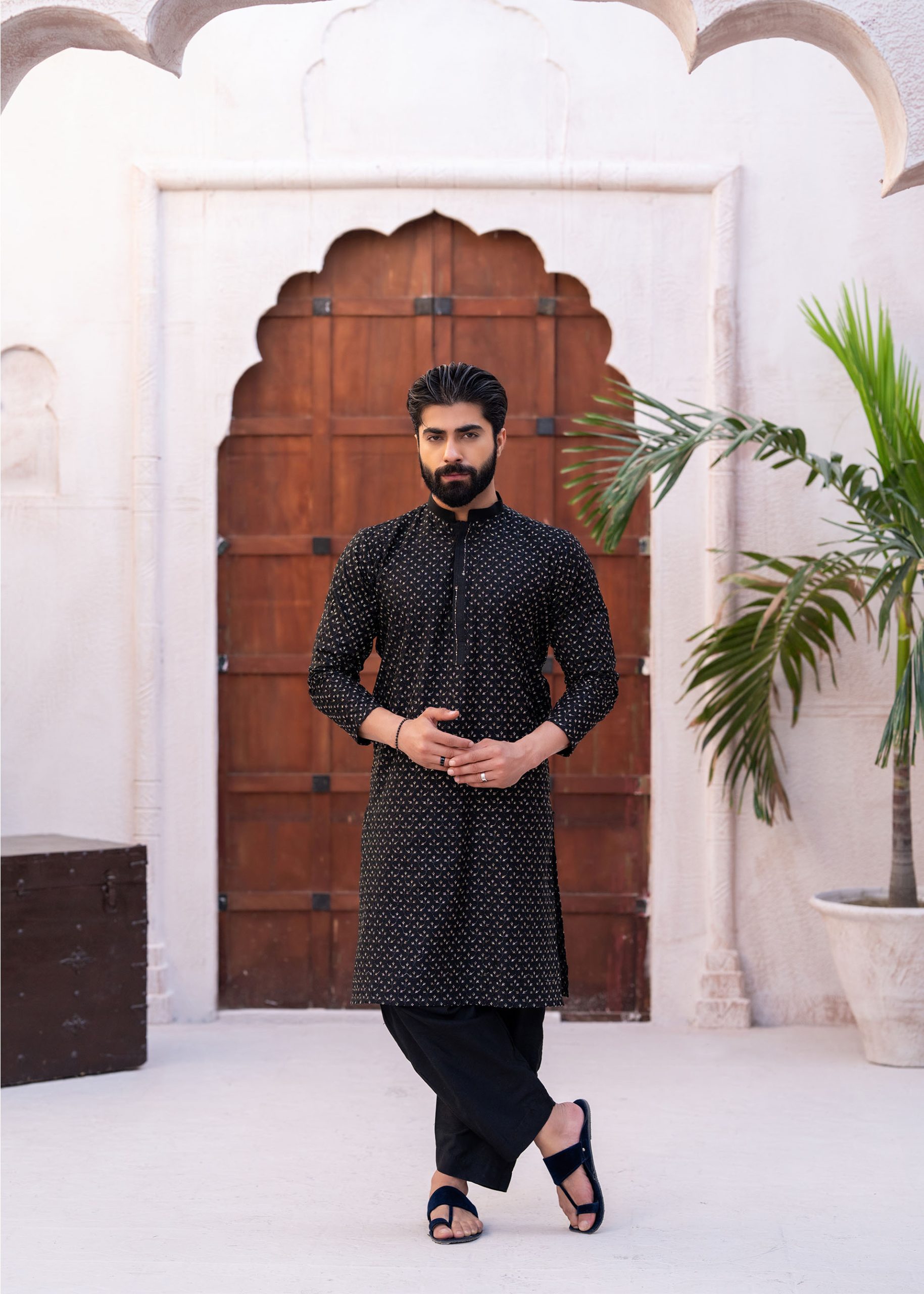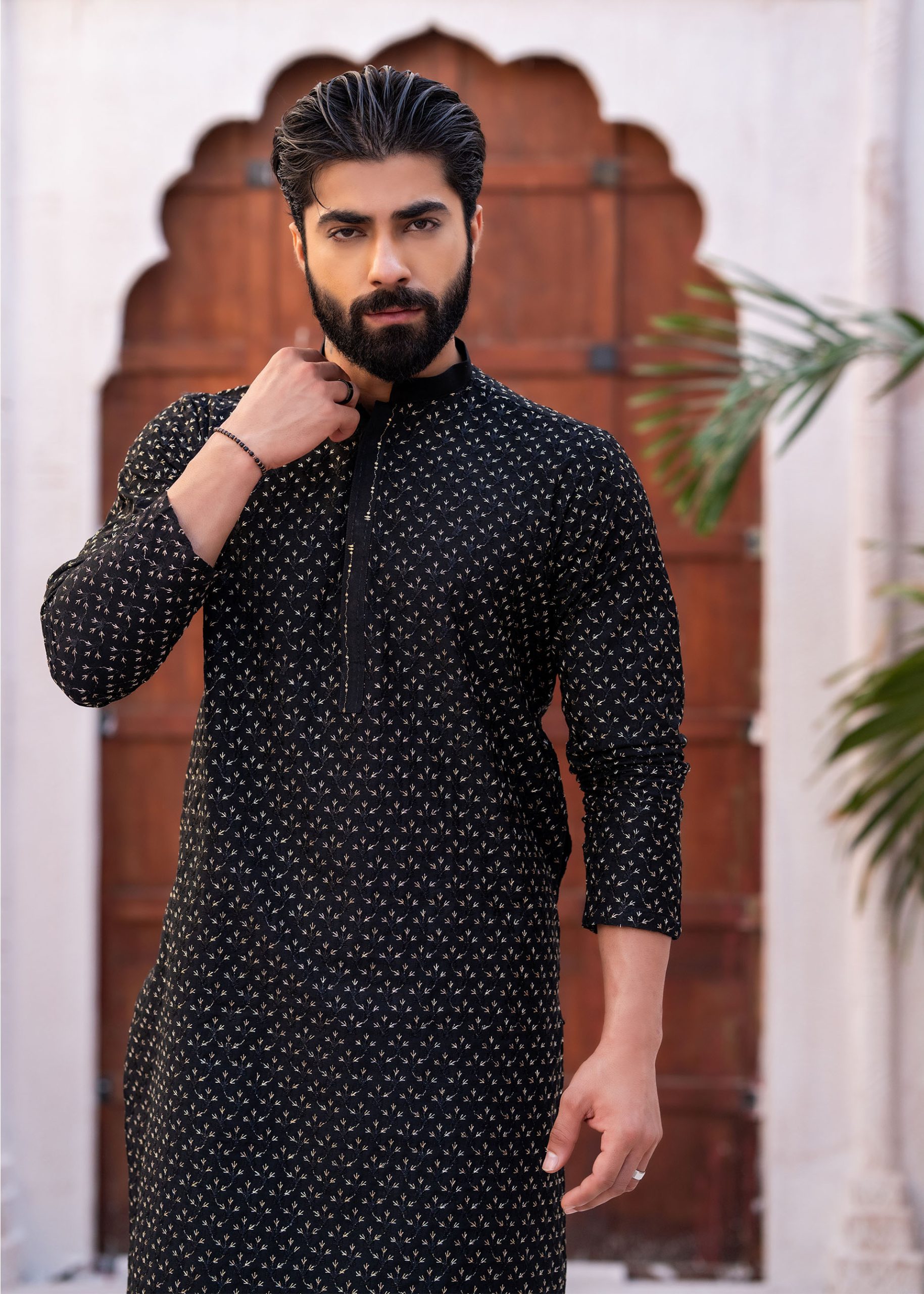A premium textured kurta, featuring a sleek, tailored fit and a rich fabric with an elegant self-patterned texture.